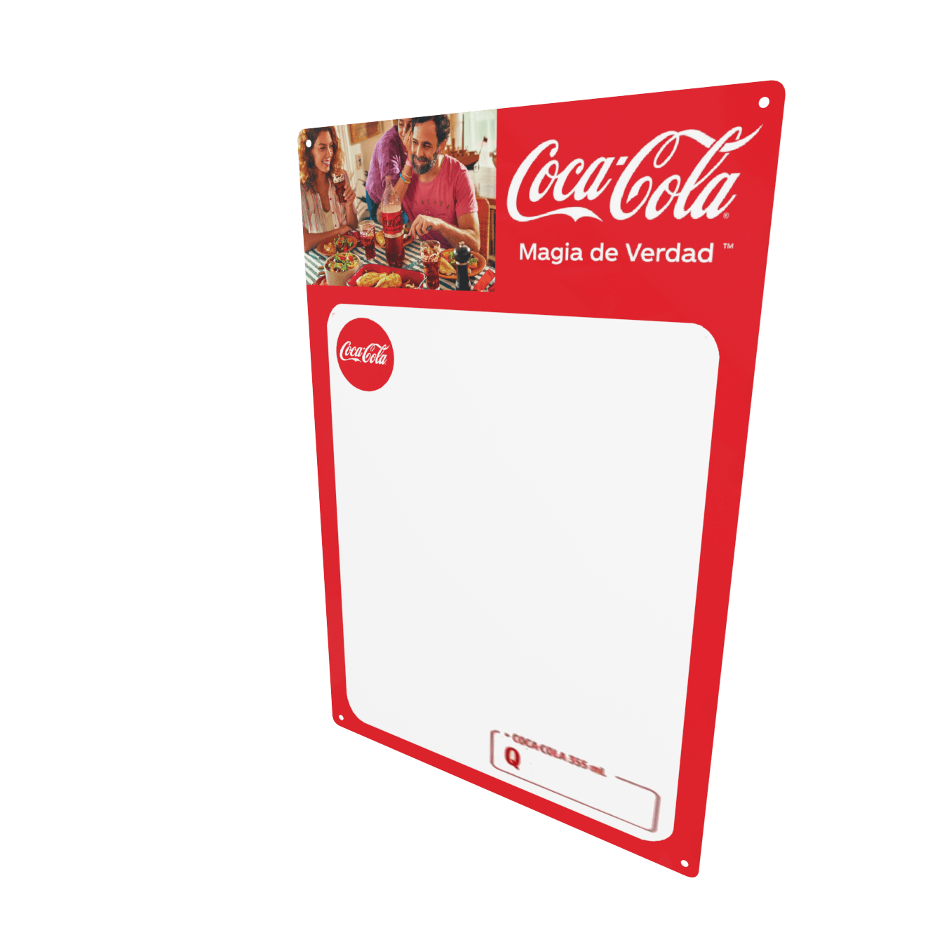 Pizarra termoformada, con área para escribir con marcador, impresión de la marca en una cara.