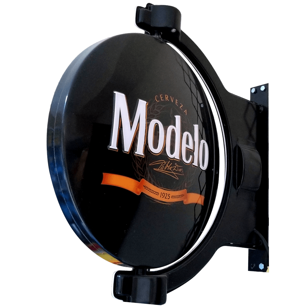 Banderola termoformada con dos carátulas y dos marcos, impresión de la marca en ambas carátulas y marcos, accesorios para giro, pata para instalación (accesorios de instalación no incluidos).